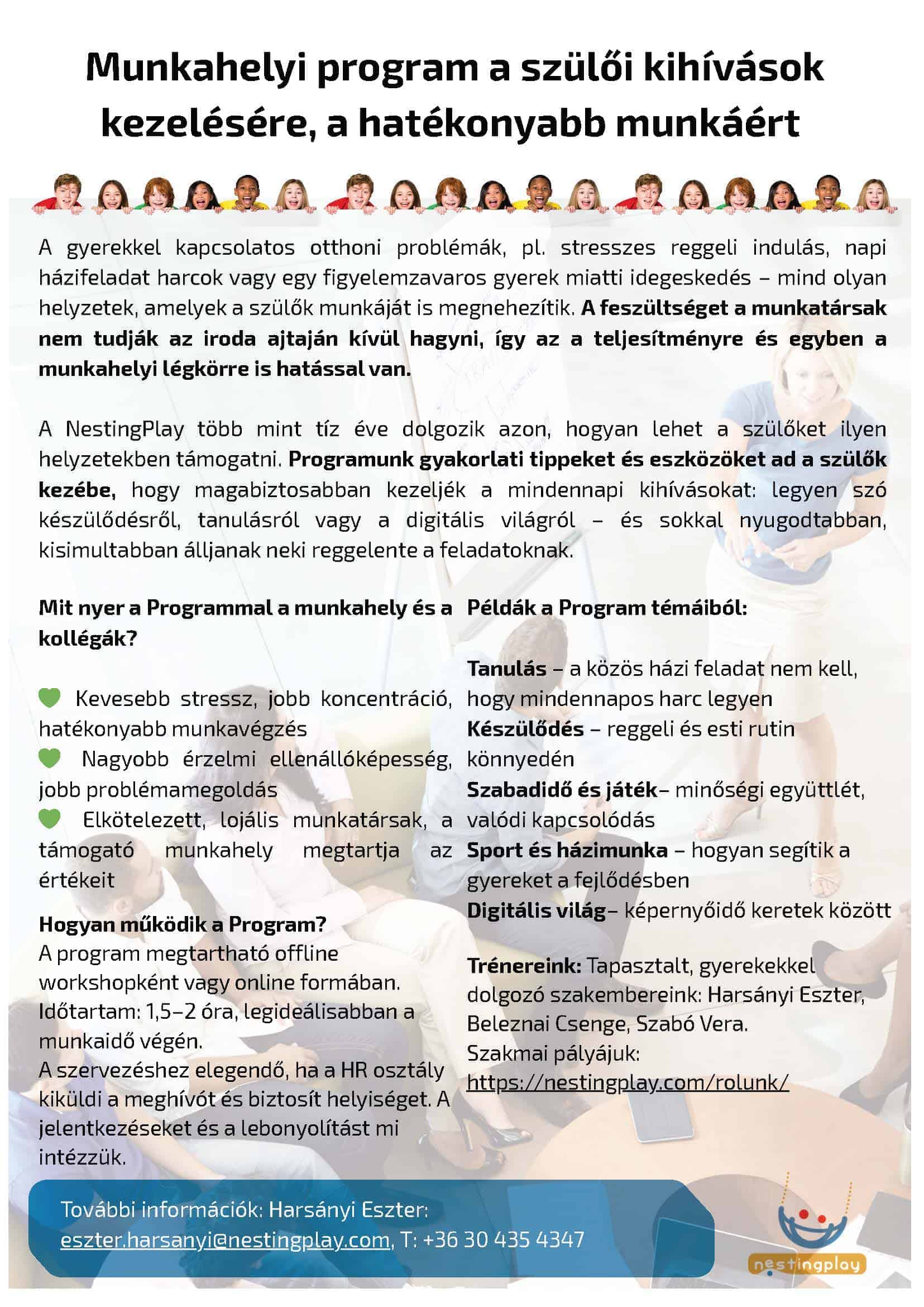 A szülői szerep kihívásai – reggeli káosz, figyelemzavaros gyerekek, digitális küzdelmek – nem maradnak otthon, és jelentősen befolyásolják a munkahelyi teljesítményt és légkört. A NestingPlay gyakorlatorientált, 1,5–2 órás workshopja segít a dolgozó szülőknek abban, hogy magabiztosabban, tudatosabban és nyugodtabban kezeljék a kihívást jelentő hétköznapi helyzeteket.  Segítünk a gyors készülődésben, az elindulásban, a házi feladat írásban, közös tanulásban. Olyan módszereket mutatunk, amik előhúzhatók idegeskedés, veszekedés, könyörgés, felrobbanás (rosszabb esetben büntetés) helyett, ami csökkenti a késéseket.