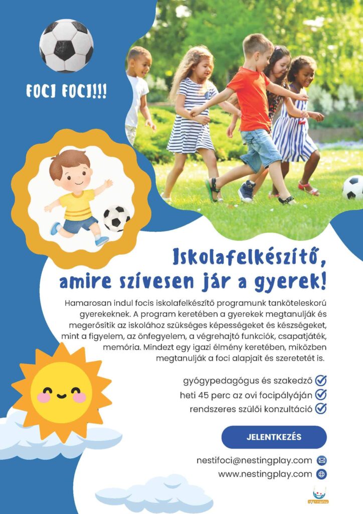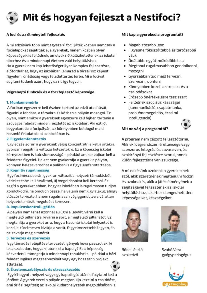 A Nestifoci egy élményalapú, heti egy alkalmas foglalkozás, amelyet szakedző és gyógypedagógus közösen alakított ki nagycsoportos óvodások számára. A program során a gyerekek játékos formában, a foci élményén keresztül készülnek fel az iskolára, fejlődnek az iskolához szükséges kompetenciáik, miközben elsajátítják a foci alapjait is.